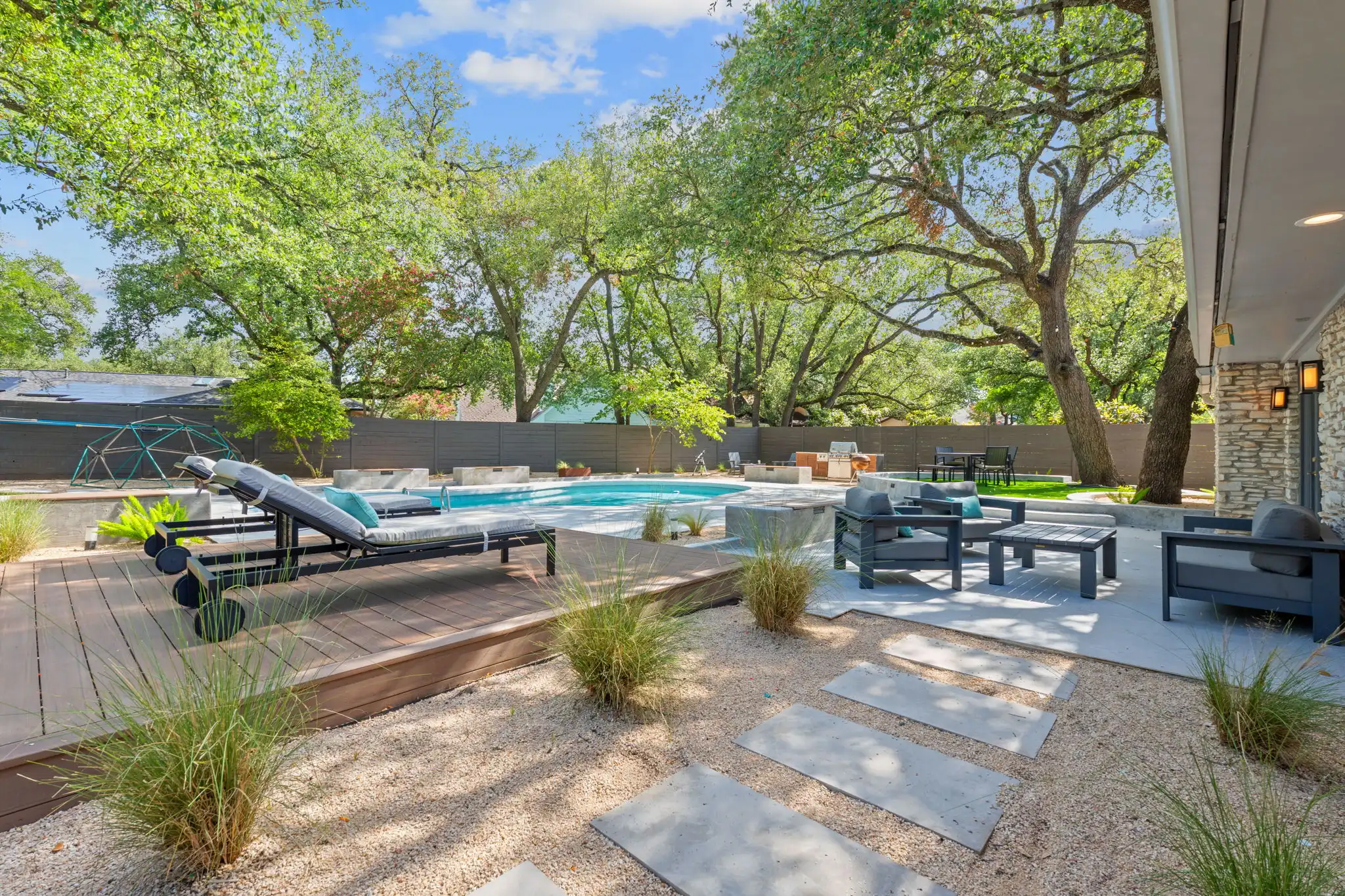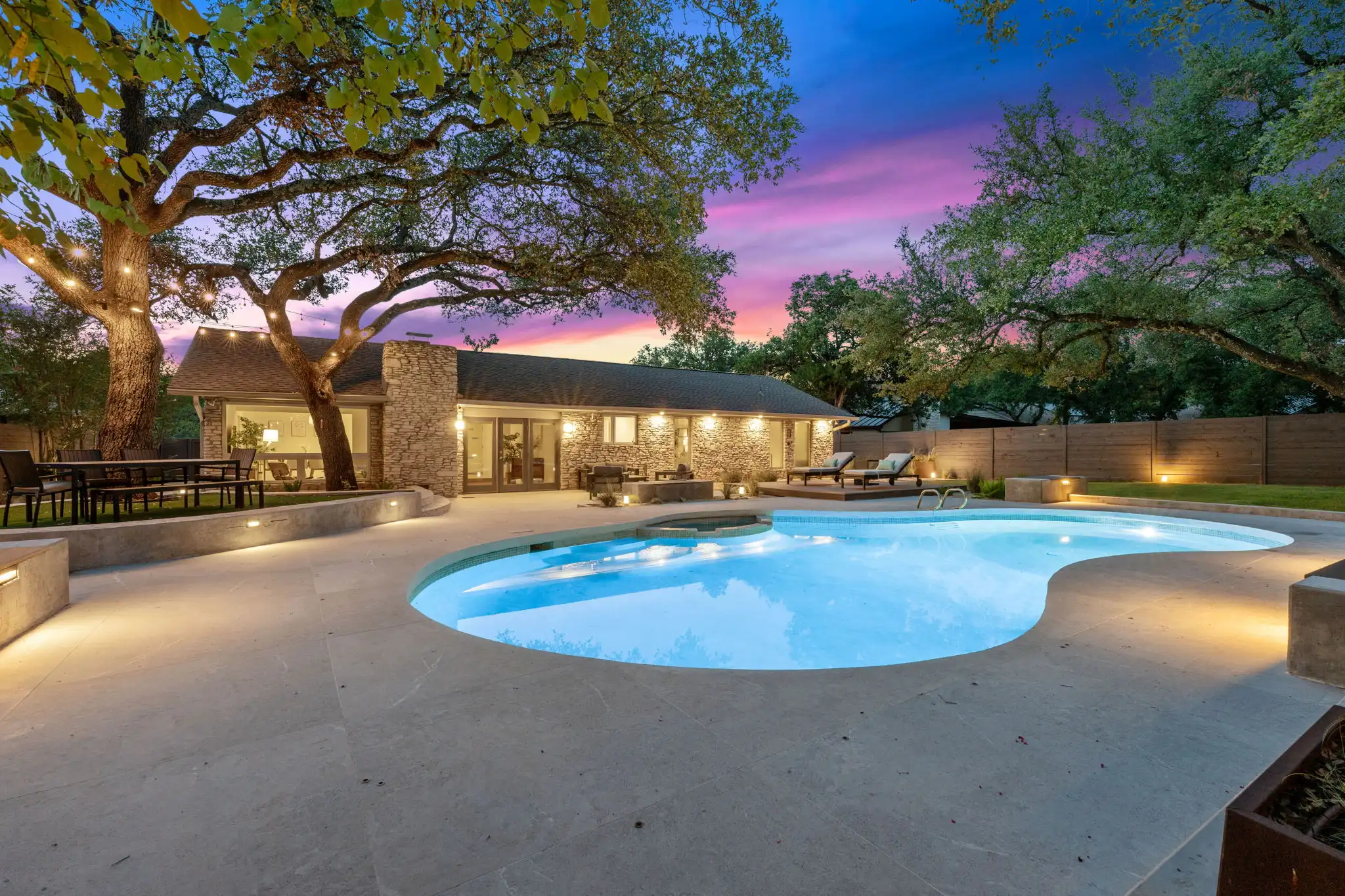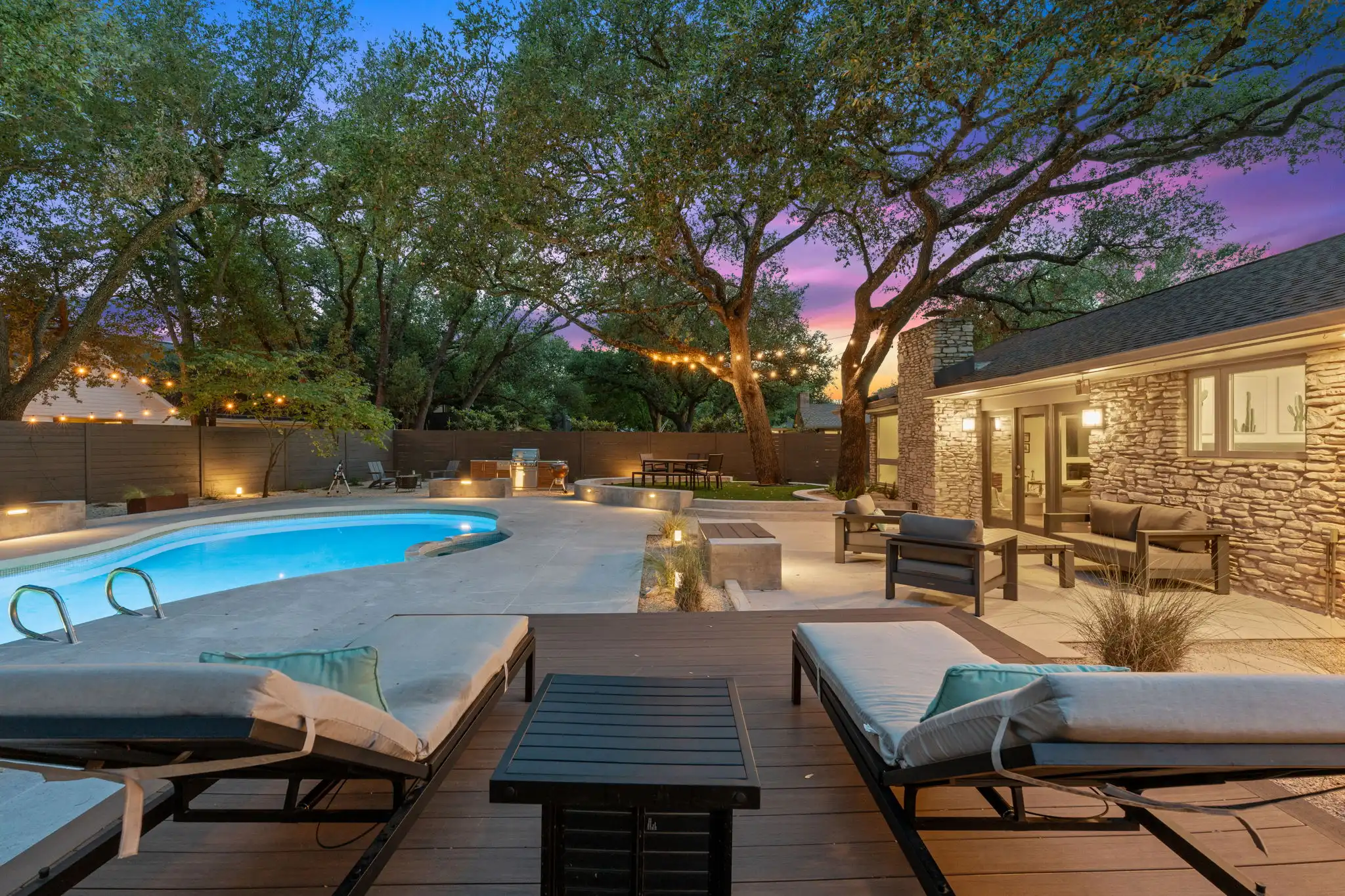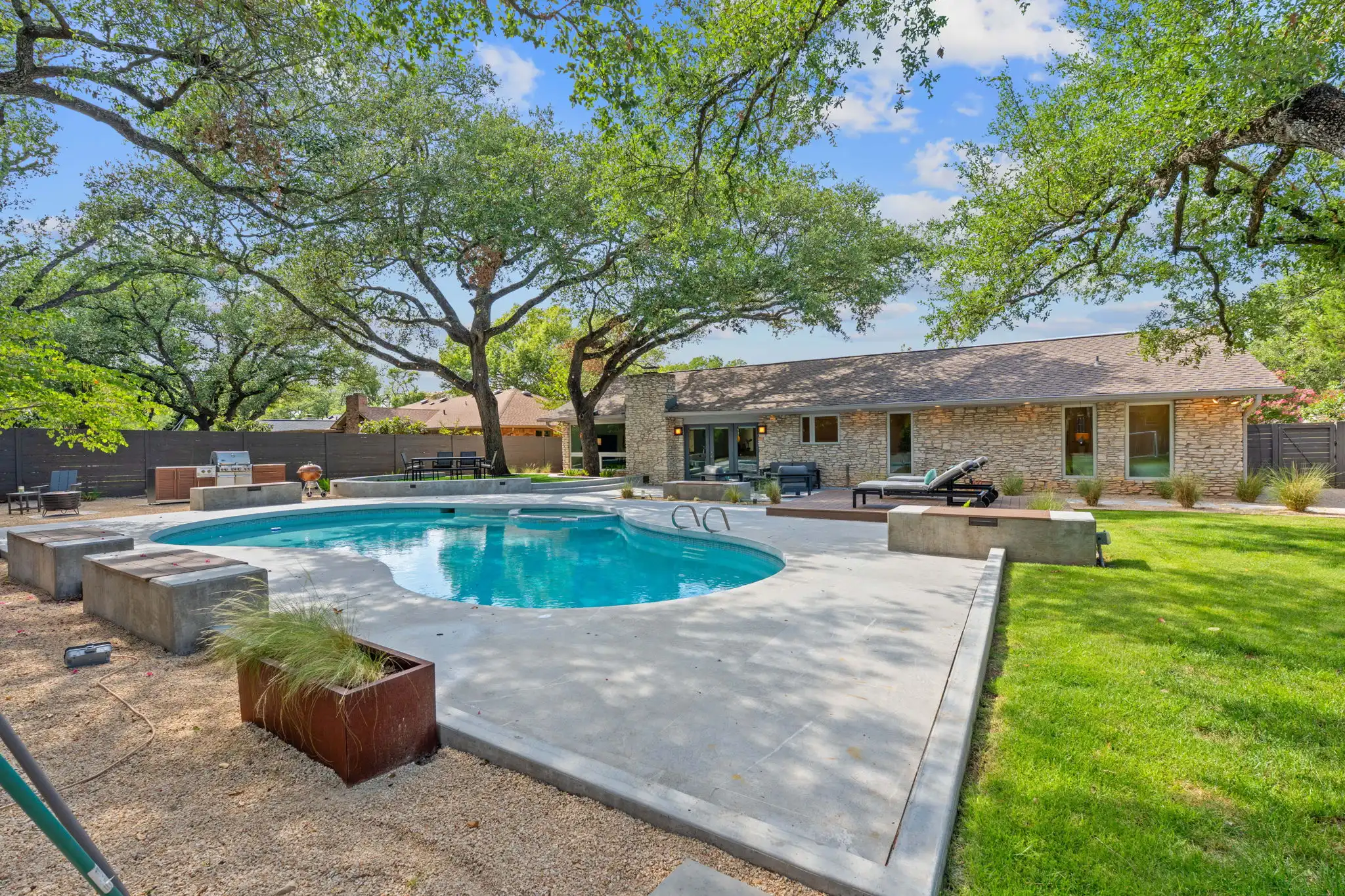 The expansive den, the true heart of the home, is graced with architectural picture windows that seamlessly connect the indoors to the serene backyard oasis. Enjoy Texas summers in style with a partially shaded pool surrounded by majestic oaks and charming dwarf redbuds, creating a private retreat for relaxation and gatherings.