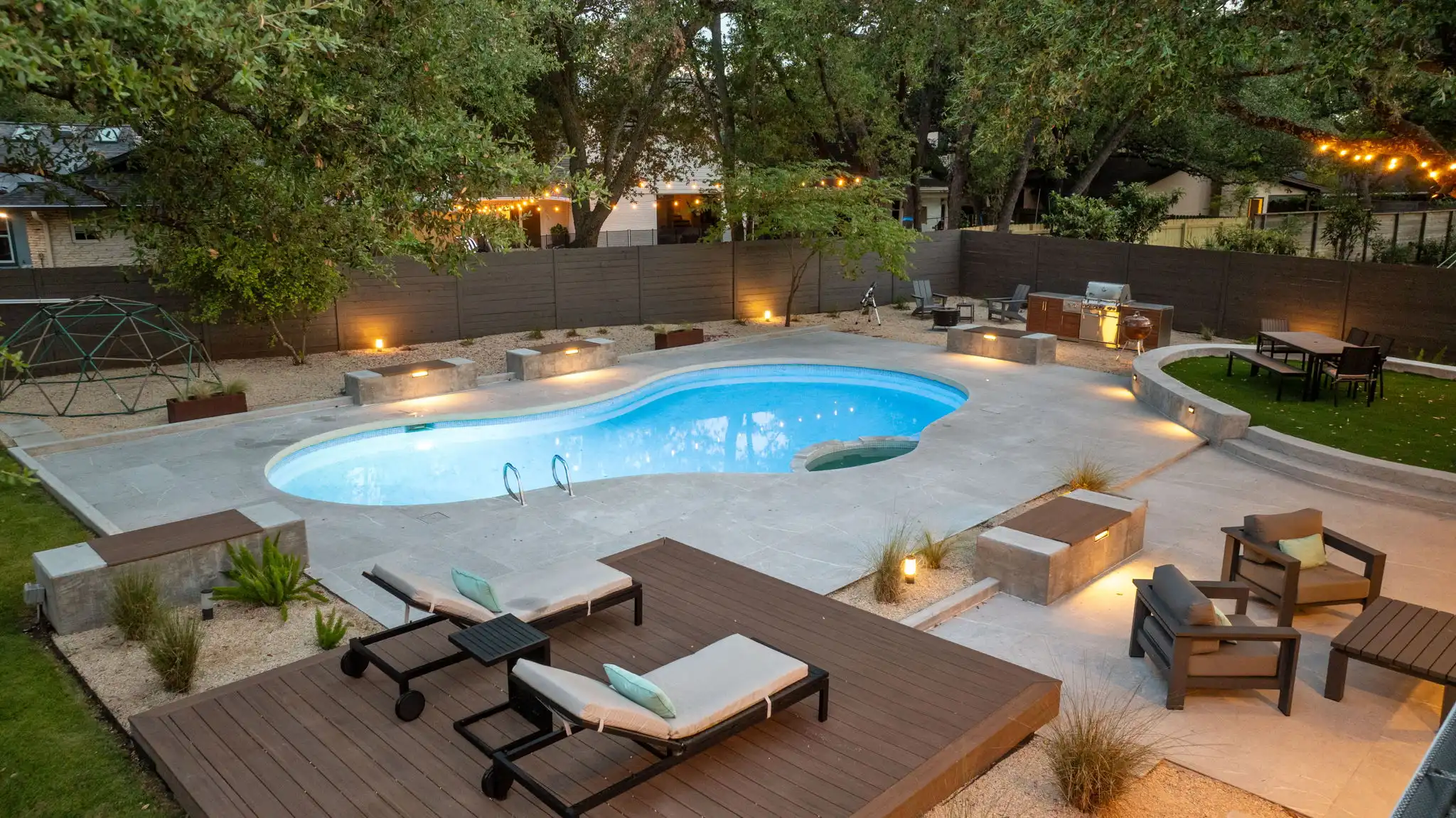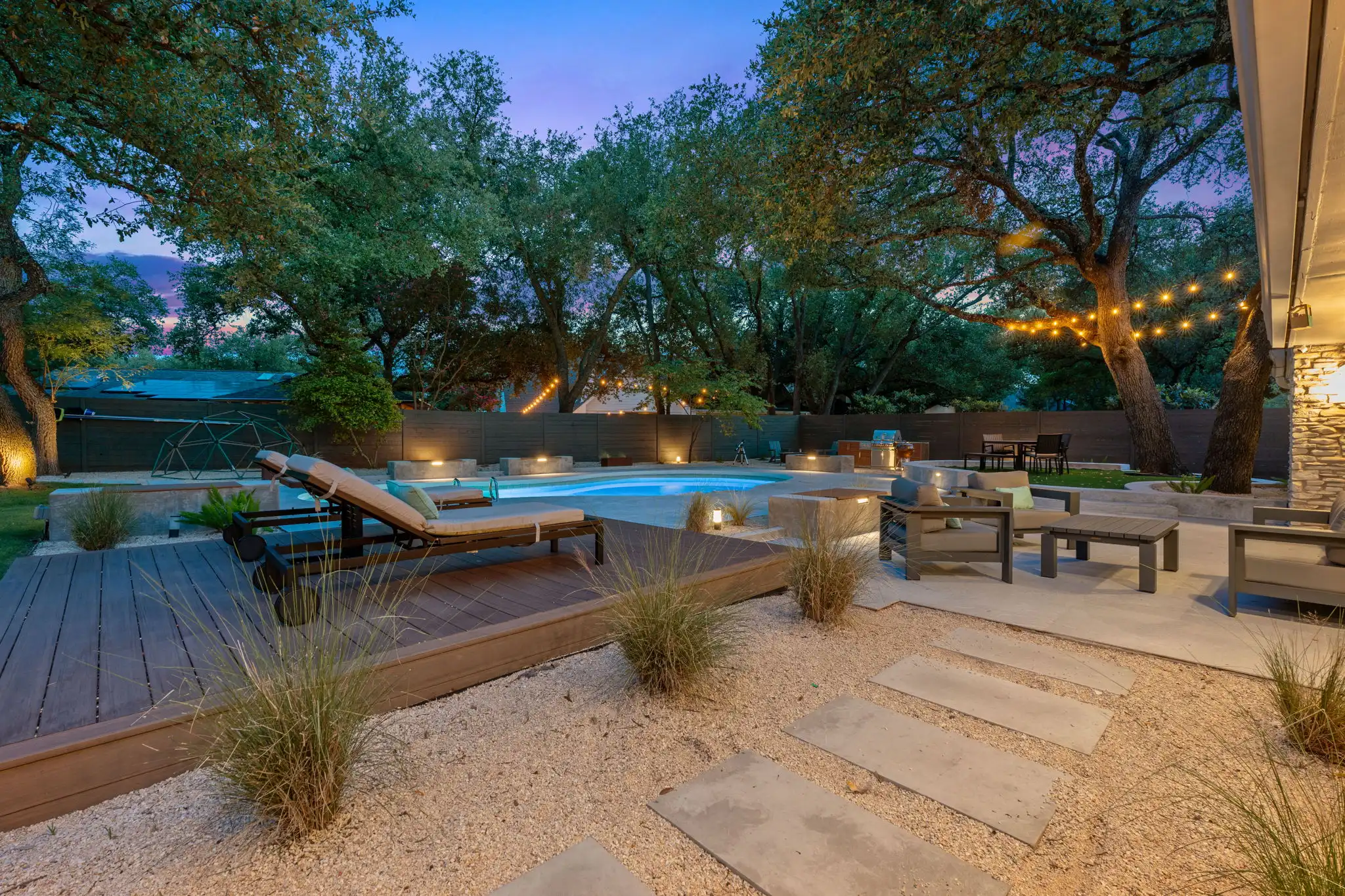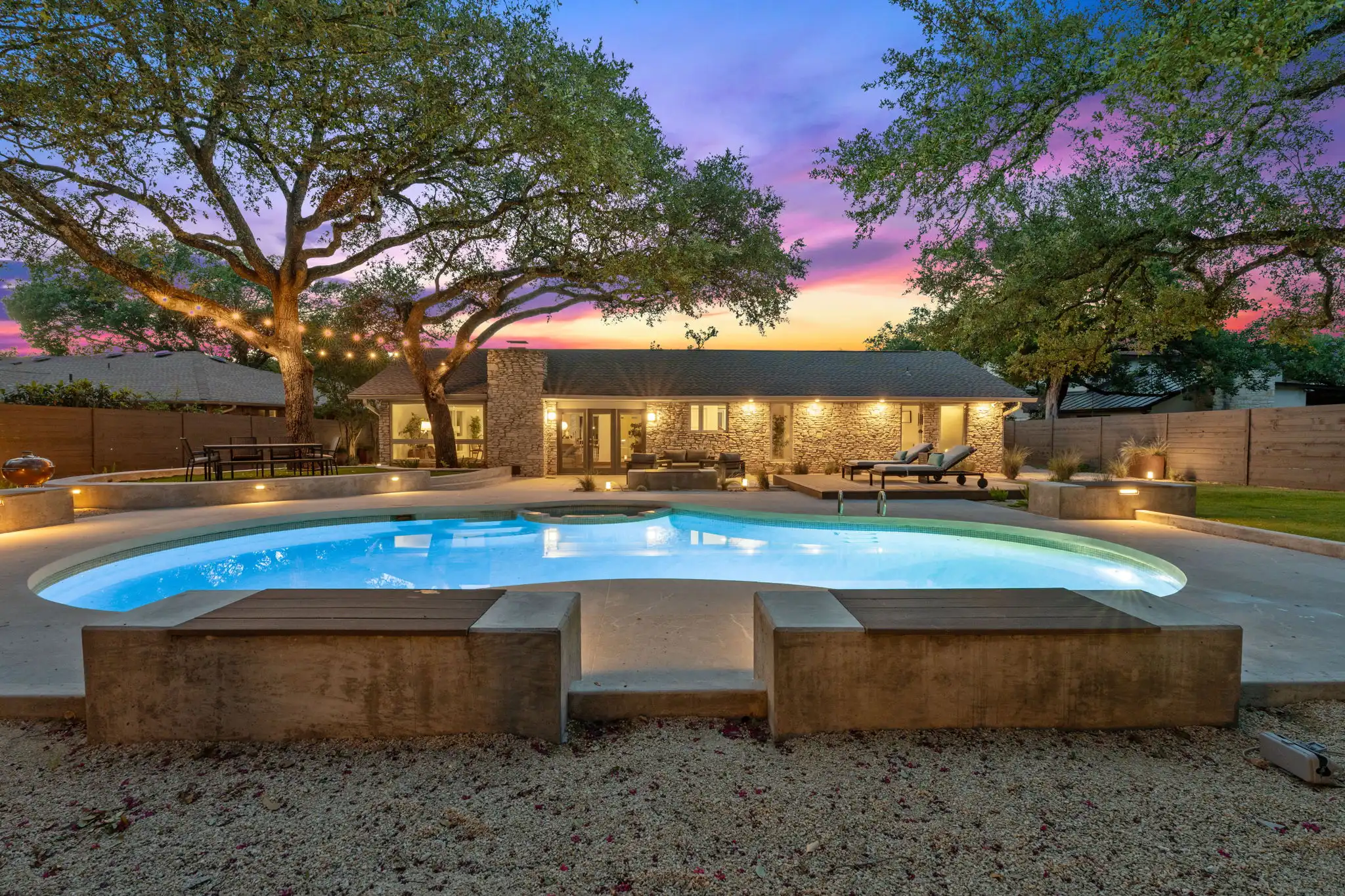 The expansive den, the true heart of the home, is graced with architectural picture windows that seamlessly connect the indoors to the serene backyard oasis. Enjoy Texas summers in style with a partially shaded pool surrounded by majestic oaks and charming dwarf redbuds, creating a private retreat for relaxation and gatherings.