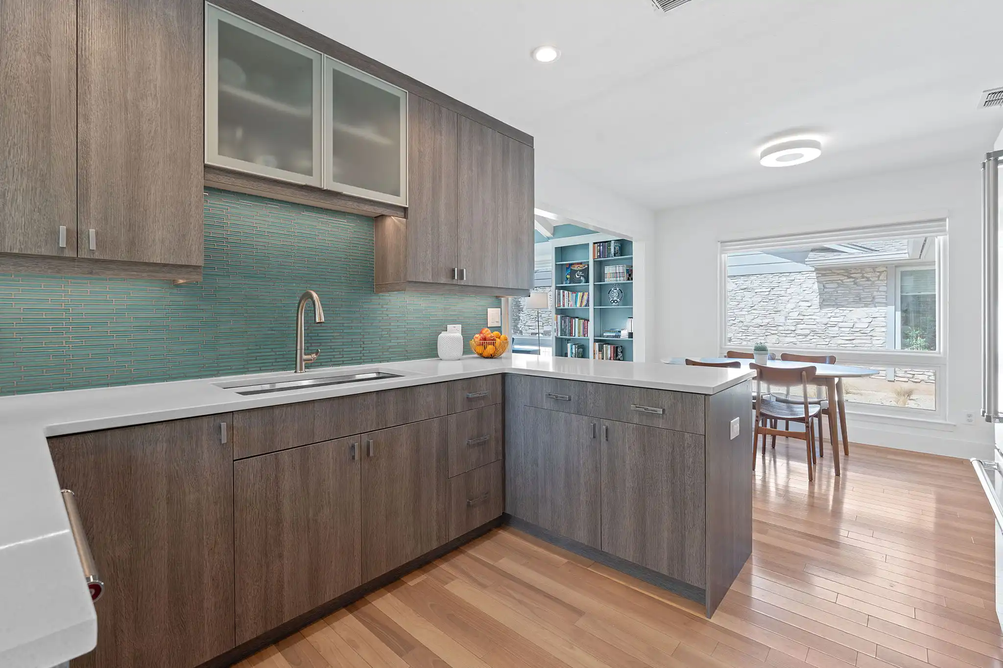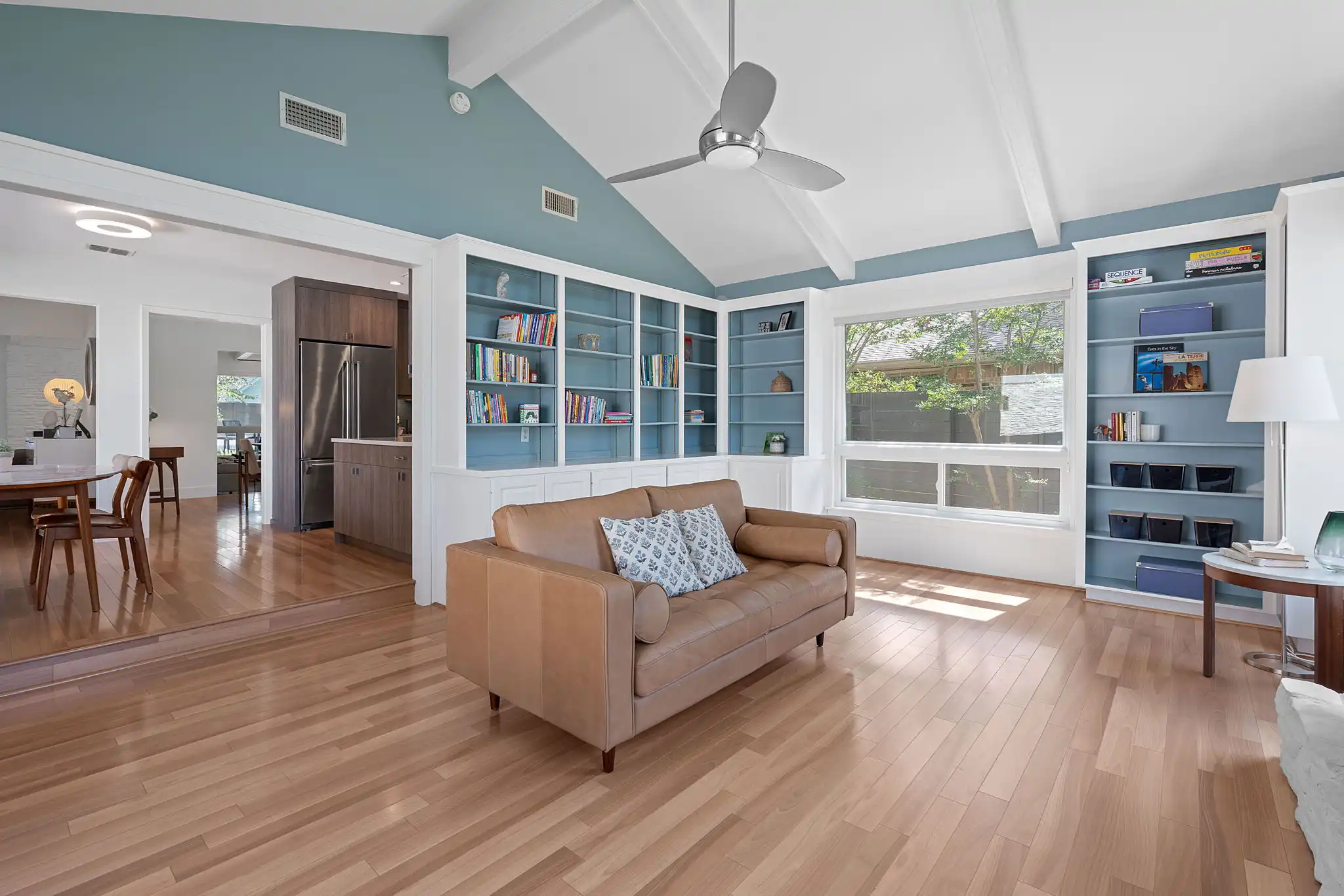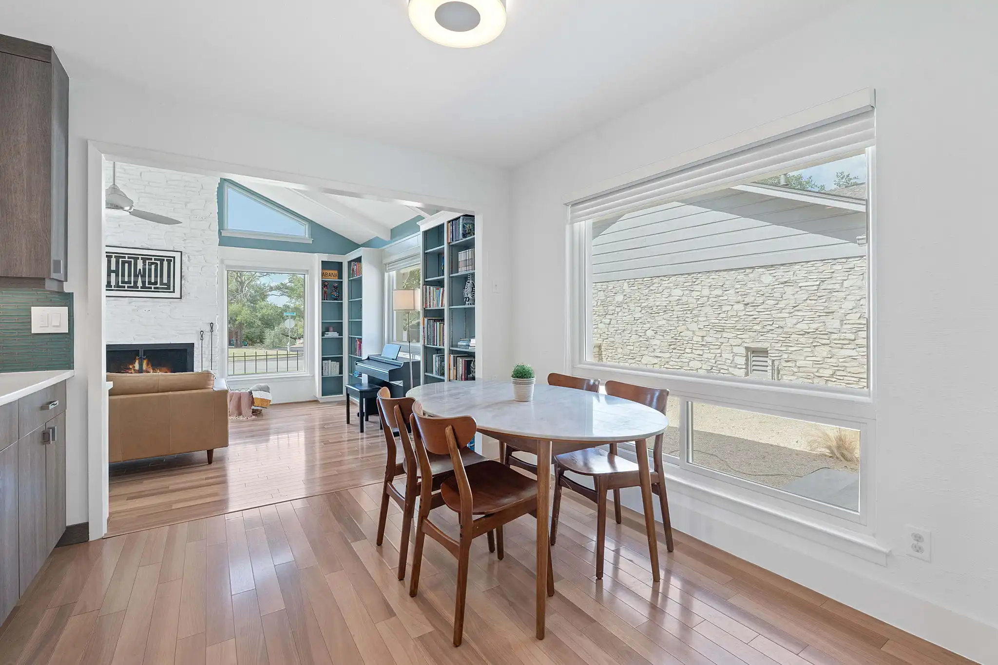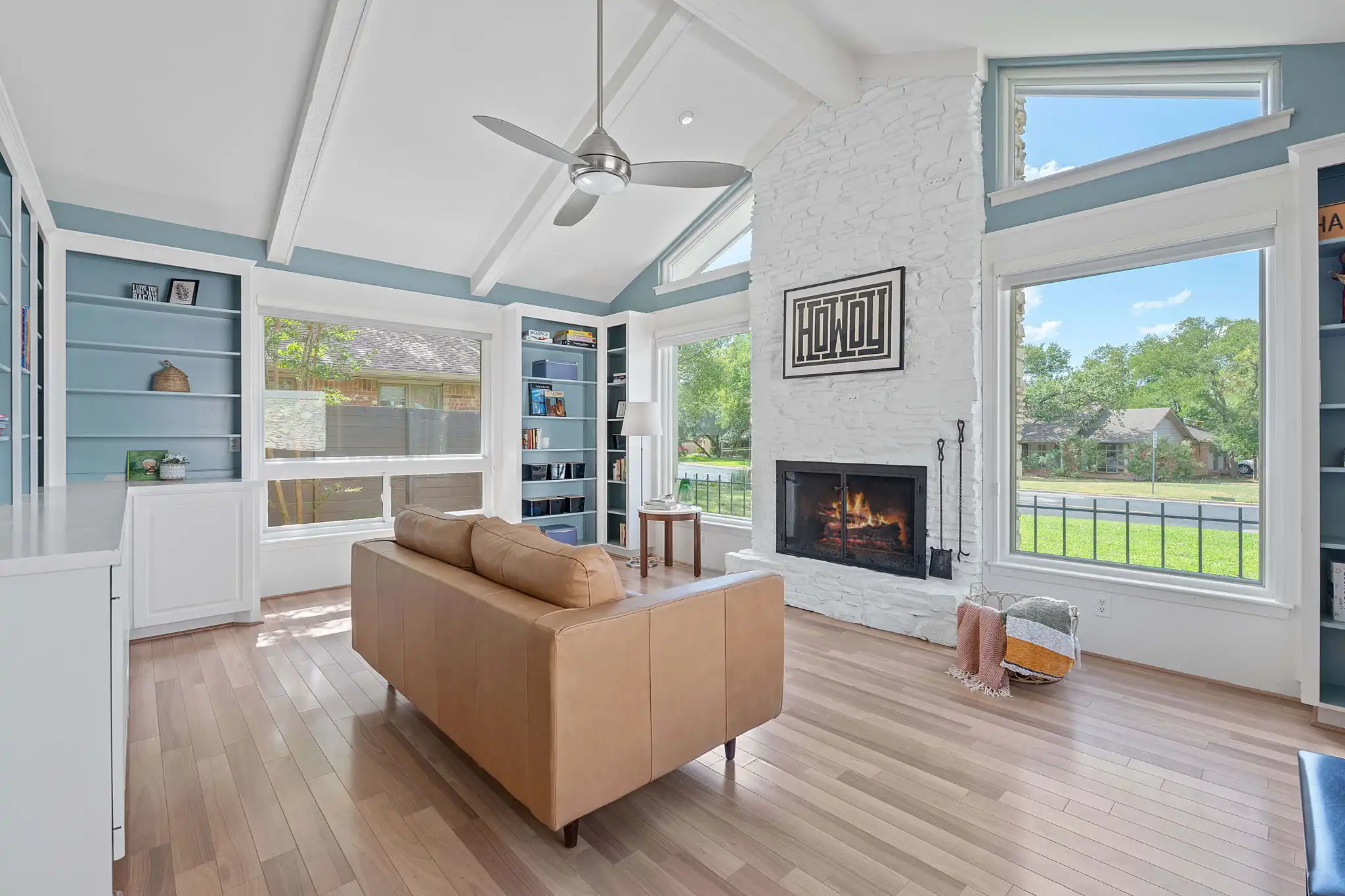 The expansive den, the true heart of the home, is graced with architectural picture windows that seamlessly connect the indoors to the serene backyard oasis. Enjoy Texas summers in style with a partially shaded pool surrounded by majestic oaks and charming dwarf redbuds, creating a private retreat for relaxation and gatherings.