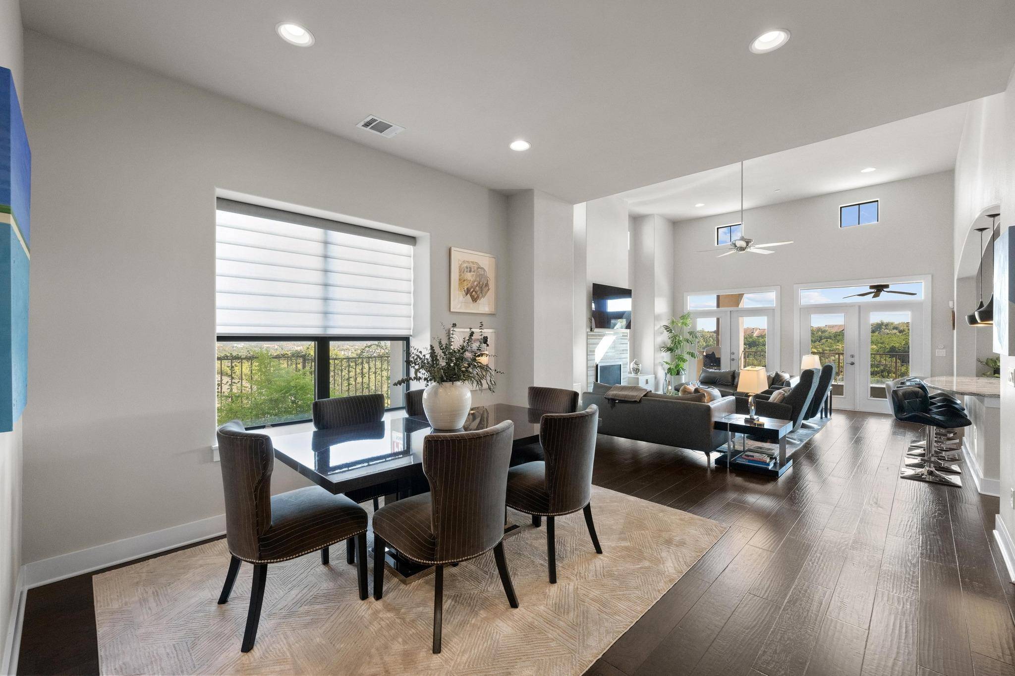 Experience elevated Hill Country living in this stunning multi-level residence at The Enclave at Escondera. Offering 3 bedrooms, 3 full baths, and 3,316 sq ft of thoughtfully designed space, this home blends luxury, comfort, and a true lock-and-leave lifestyle just minutes from downtown Austin. The open main level welcomes you with high ceilings, engineered wood floors, and walls of windows framing beautiful Hill Country views. The gourmet kitchen features sleek Dacor stainless-steel appliances, a wine refrigerator, and a large island that flows seamlessly into the spacious family room—perfect for entertaining. This level also includes an elegant office, a secondary bedroom, and a full bath, offering flexibility for guests or multi-generational living. Downstairs, you'll find a generous living area with a kitchenette—complete with sink, full-size refrigerator space, and large island—plus a guest suite featuring an en-suite bath, cozy fireplace, and access to a serene patio. The outdoor space is fully turfed and includes a private putting green, ideal for relaxing or entertaining. Enjoy Hill Country and greenbelt views from both the main-level balcony and the expansive rooftop deck. Automated shades, abundant natural light, and a 2-car garage enhance the home's ease and sophistication. The gated community offers a fitness center near the entrance and a walking trail that leads to the resort-style pool. Conveniently located near Lantana Place, enjoy upscale amenities including Moviehouse & Eatery, Carve American Grille, Black Rock Coffee, and boutique shops and services—all just moments away. Discover refined Hill Country tranquility paired with city convenience in this exceptional Enclave at Escondera home.